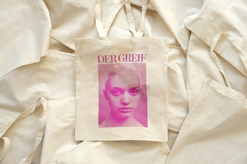 The highly requested cotton tote bag is available again – featuring a silkscreen print of the cover image of the anniversary issue Der Greif #7.